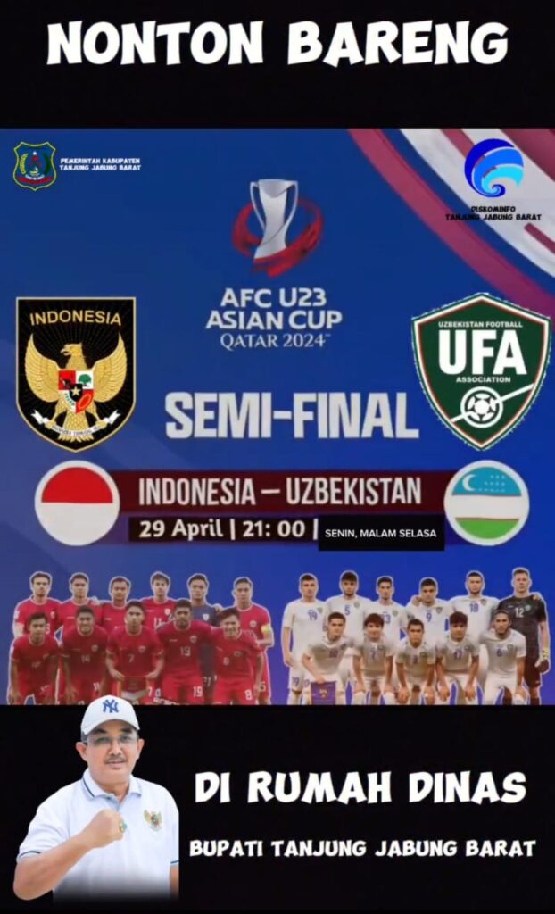Ranjaunews.com, Kuala Tungkal – Sebagai bentuk dukungan atas langkah Timnas Indonesia U-23 di semifinal Piala Asia 2024, Bupati Tanjab Barat H. Anwar Sadat adakan nonton bareng (nobar) laga Timnas lawan Uzbekistan pada hari senin, 29 April 2024 jam 21:00 WIB di Rumah Dinas Bupati.