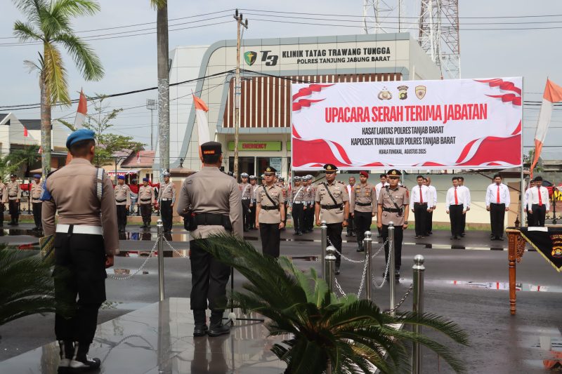 Ranjaunews.com – TANJAB BARAT – Jajaran Polres Tanjab Barat menggelar upacara serah terima jabatan (sertijab) untuk posisi Kasat Lantas dan Kapolsek Tungkal Ilir pada Jumat pagi (22/08/2025). Upacara yang dipimpin langsung oleh Kapolres Tanjab Barat ini berlangsung di Lapangan Apel Mako Polres Tanjab Barat.