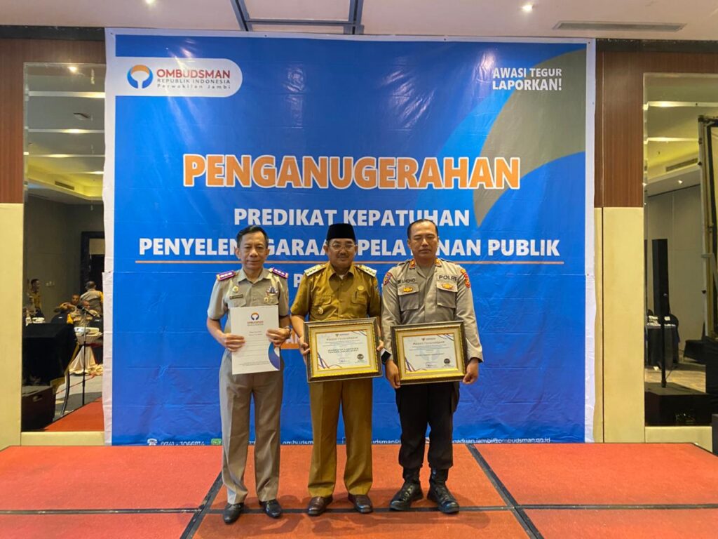 Ranjaunews.com – Polres Tanjab Barat – Kapolres Tanjab Barat, AKBP AGUNG BASUKI, S.I.K., M.M, diwakili oleh Kasiwas Polres Tanjab Barat IPTU WAHONO menghadiri kegiatan Penganugrahan Penilaian Kepatuhan Penyelenggaraan Pelayanan Publik oleh Ombudsman Republik Indonesia Perwakilan Jambi Tahun 2024, yang dilaksanakan di Hotel Aston Telanaipura Jambi Mapolres Tanjab Barat, pada Selasa (03/12/24).